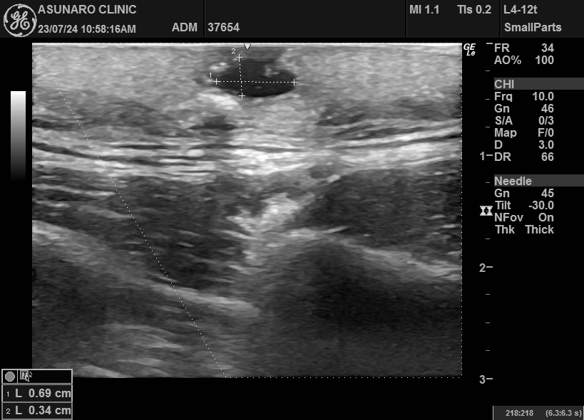 超音波検査は典型的な粉瘤でした。皮膚が粉瘤で薄くなっていましたが、超音波下での被膜剥離を行い、5ミリのくりぬき法で、被膜を完全切除できました。